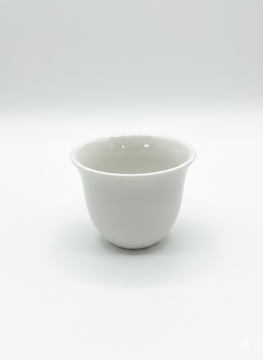 طقم فاخر لتقديم القهوة والتمر، يضم 6 فناجين سيراميك وقاعدة مزخرفة بالخط العربي وعبارة "رمضان كريم"، مثالي لمائدة الإفطار والسحور.