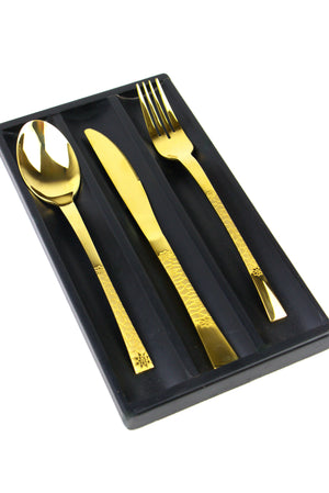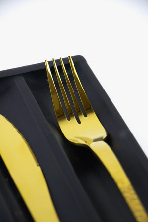 طقم أدوات مائدة أرشيا الذهبي، 86 قطعة، مصمم ليُبهر الجميع، يجمع بين الأناقة الخالدة والحرفية الاستثنائية. مصنوع من الفولاذ المقاوم للصدأ الفاخر بلمسة نهائية ذهبية لامعة، كل قطعة تتميز بتصميم أنيق وعصري، مما يجعله إضافة مثالية لأي طاولة.