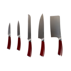 Contains: 5-piece knife set, including a chef's knife, bread knife, utility knife, paring knife, and cleaver, ideal for all kitchen tasks.