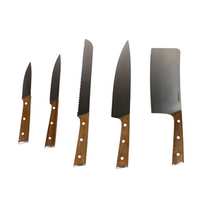 Contains: 5-piece knife set, including a chef's knife, bread knife, utility knife, paring knife, and cleaver, ideal for all kitchen tasks.
