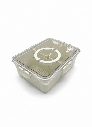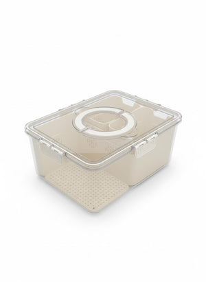 Smart organizer to keep fruits and vegetables fresh. Features 3 inner baskets with ventilation holes for draining water. Secure lid with adjustable vents and side handles for easy carrying. Rectangular stackable design saves space, ideal for small fruits, leafy greens, and chopped vegetables.