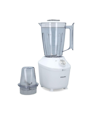 The Philips HR2191/20 Blender from Series 3000 features a 2L capacity (1.25L effective) and 600W motor. Equipped with the ProBlend system for efficient blending and chopping, it offers 2 speed settings plus pulse function. Comes with a transparent plastic jar, ideal for crushing, whipping cream, and everyday mixing tasks. Portable design for convenient tabletop use, with international warranty included.
