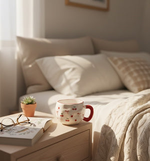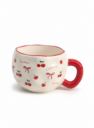 Ceramic mug with an irregular organic shape, decorated with small cherries and pink bows, bright red handle, and handwritten words like “Sweet” and “Cherry”.
