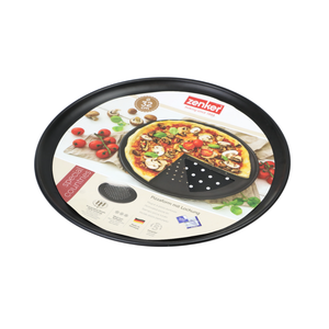 You can now bake juicy pizzas with crispy bases just like you'd get at an Italian restaurant in your own oven with the non-stick pizza tray from Zenker. The perforated, round baking tray from Zenker (Ø 32 cm, height approx. 1.5 cm) fits in any oven and is ideal for baking and reheating frozen products such as pizza, French fries, and rolls, as well as quick-baked items such as cookies and homemade potato or vegetable chips. The specially perforated tray base ensures even heat conduction and browning of the baked goods. The baking tray, with its excellent non-stick coating, is heat-resistant up to +230°C and can be easily cleaned by hand after use. Zenker offers a 5-year warranty on this "Made in Germany" tray. The baking tray impresses with its perforated base: Frozen products and foods that require only a short baking time are baked particularly effectively and evenly thanks to the perforated tray base. This is how you get the most out of pizza, fries, and more!