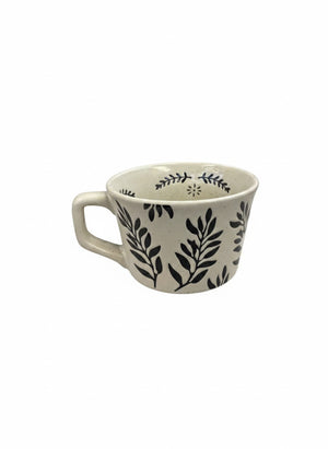A creamy white ceramic mug with natural speckles and brown tree branch patterns, featuring a rustic elegant design and a comfortable geometric handle.